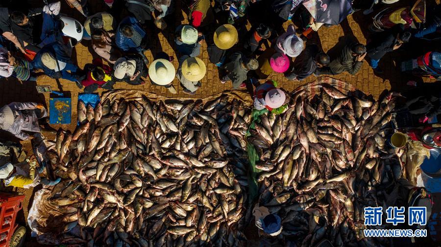 12月25日,人們在星云湖畔的老河咀魚市選購剛捕撈的鮮魚(無人機(jī)拍攝)。新華社記者胡超攝