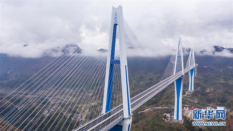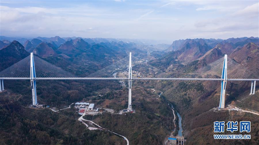 2019年1月7日無人機航拍的平塘特大橋橋塔全景,中為高332米的世界第一高混凝土橋塔。新華社記者歐東衢攝