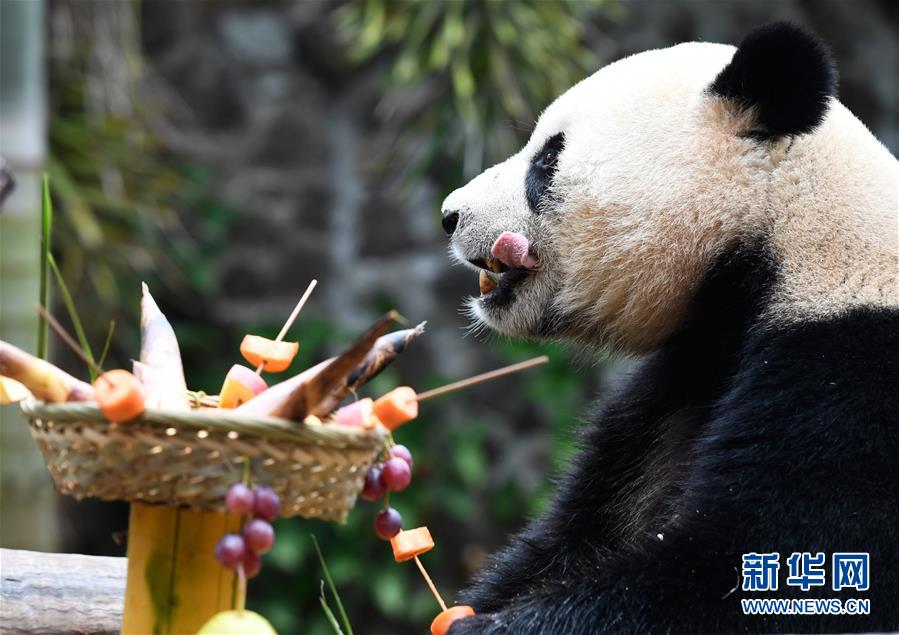 當(dāng)日是2019年最后一天,海南熱帶野生動植物園的工作人員為園區(qū)內(nèi)大熊貓“貢貢”“舜舜”準(zhǔn)備了用葡萄、南瓜、竹筍等果蔬制作的“火鍋串串香”,讓它們用“擼串”的方式迎接新年的到來。 新華社記者 楊冠宇 攝