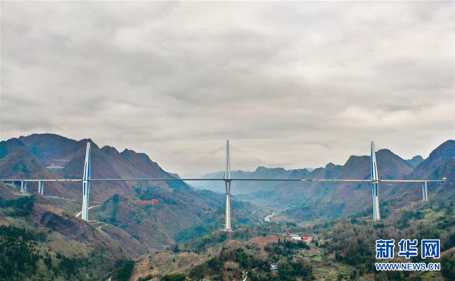 2019年1月7日無人機航拍的平塘特大橋橋塔全景,中為高332米的世界第一高混凝土橋塔。新華社記者歐東衢攝