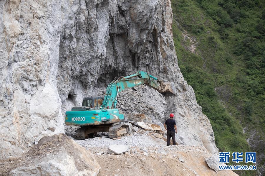 通村公路的施工人員在阿布洛哈村陡崖夾溝地勢中作業(yè)(2019年7月18日攝)。新華社記者江宏景攝