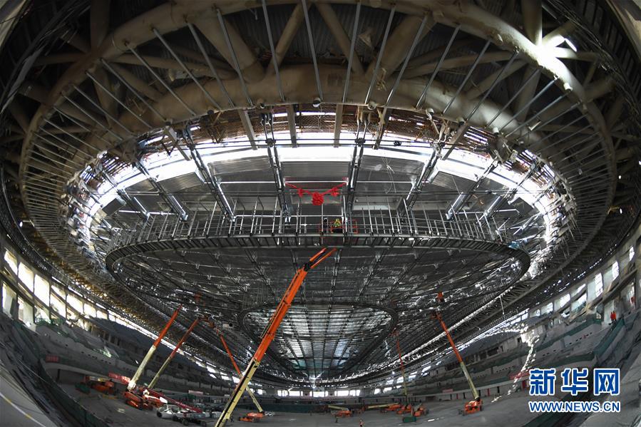 12月31日,施工人員在實(shí)現(xiàn)封頂封圍的國家速滑館施工現(xiàn)場(chǎng)工作。新華社記者鞠煥宗攝