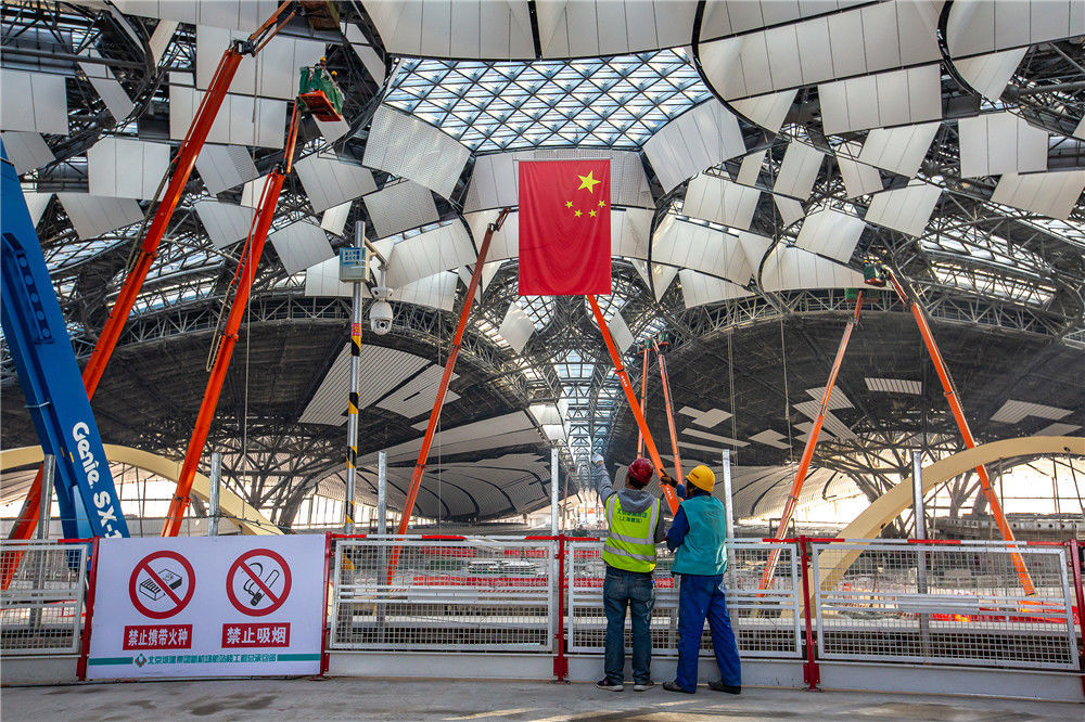 工人在北京大興國際機(jī)場主航站樓內(nèi)進(jìn)行裝修施工(2018年12月29日攝)。新華社記者鞠煥宗攝