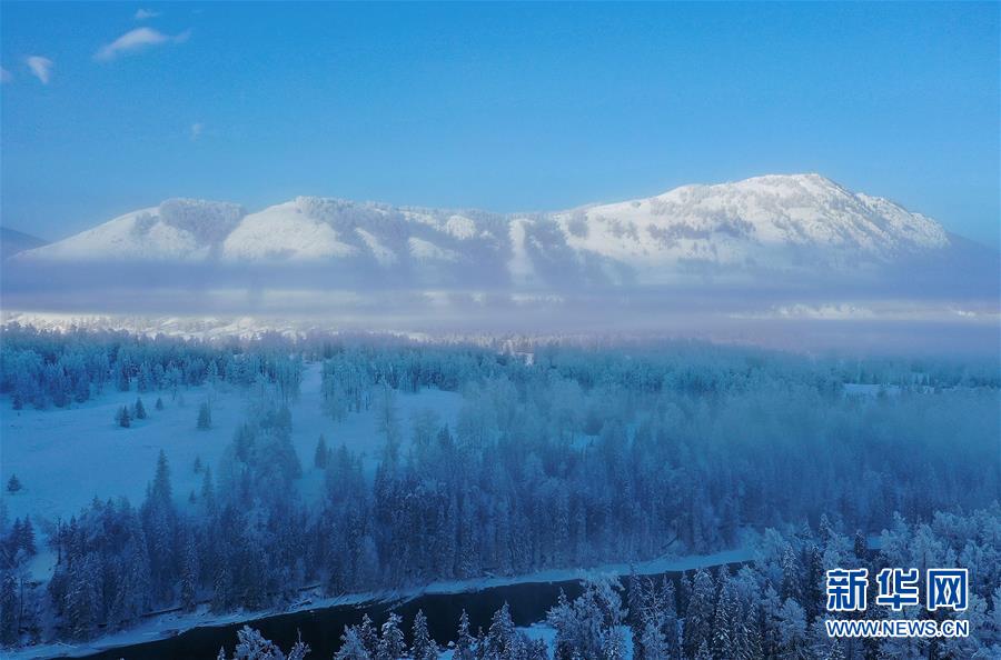 這是1月3日拍攝的喀納斯河畔的霧凇景觀(無(wú)人機(jī)照片)。