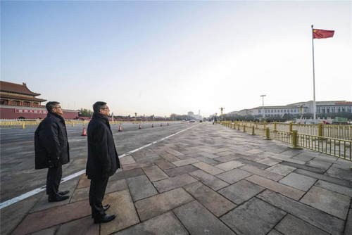 2019年12月7日,新任香港特區(qū)政府警務(wù)處處長(zhǎng)鄧炳強(qiáng)(右)率香港警務(wù)處代表團(tuán)來(lái)到北京天安門廣場(chǎng),觀看升國(guó)旗儀式。新華社記者殷剛攝