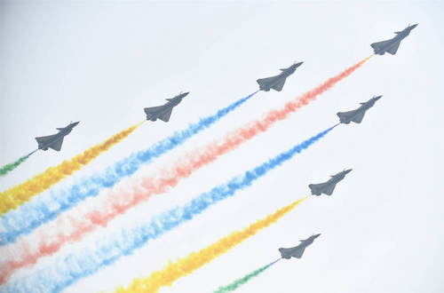 2019年10月1日,慶祝中華人民共和國成立70周年大會在北京天安門廣場隆重舉行。這是受閱的領(lǐng)隊機梯隊。新華社記者薛玉斌攝