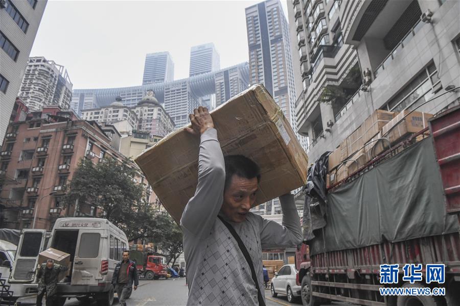 冉光輝在重慶朝天門大正商場內搬運貨物(1月5日攝)。新華社記者王全超攝