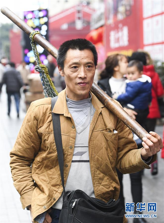 冉光輝在重慶朝天門大正商場附近等活(1月5日攝)。新華社記者王全超攝