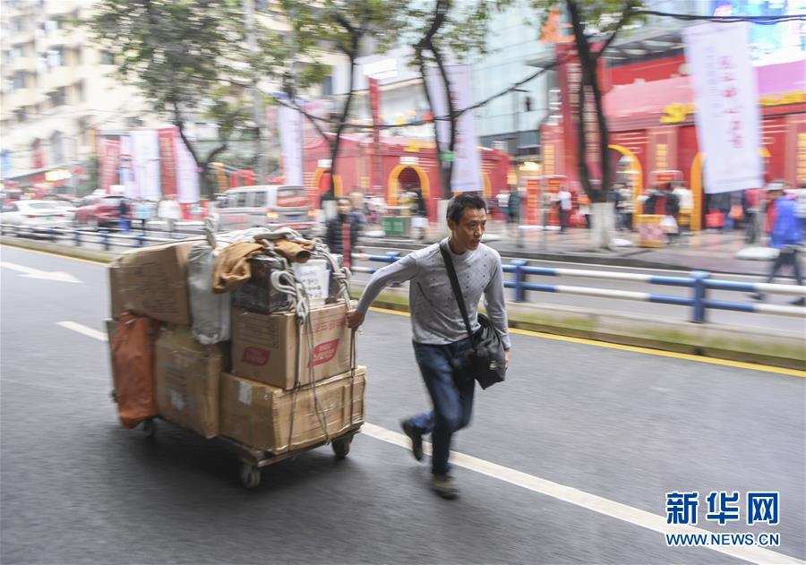 冉光輝用小板車載著貨物,從重慶朝天門大生商場出發(fā),前往發(fā)貨地點(1月5日攝)。新華社記者王全超攝