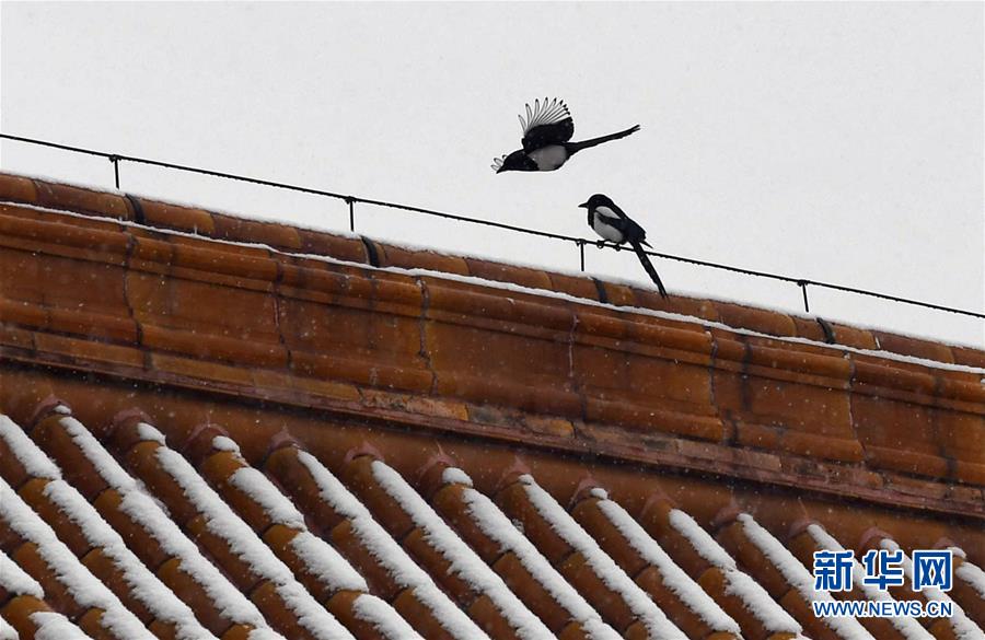 12月16日,在北京故宮,兩只喜鵲停在太和殿上。當(dāng)日,北京迎來降雪天氣。新華社記者金良快攝