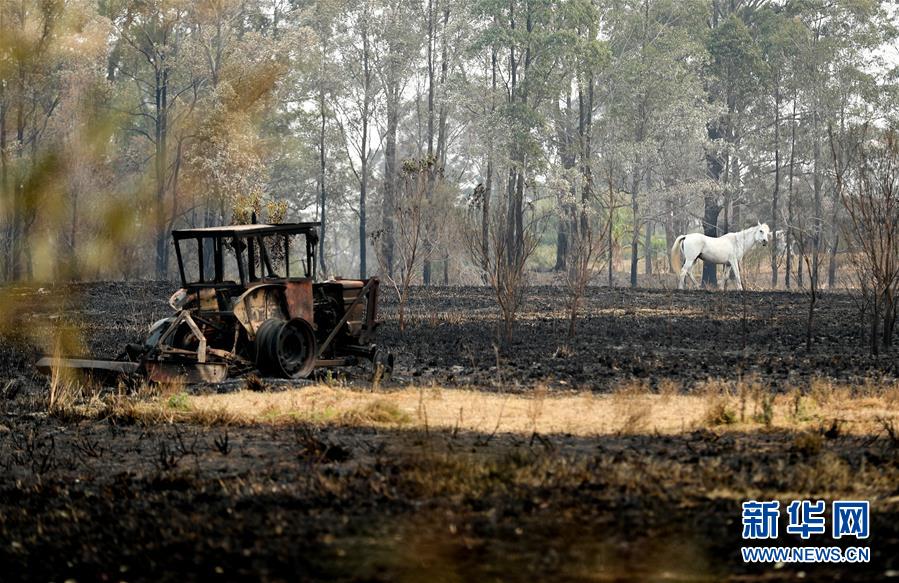 11月11日,在澳大利亞新南威爾士州麥夸里港附近,一匹白馬在山火燒過的土地上踱步。新華社記者白雪飛攝