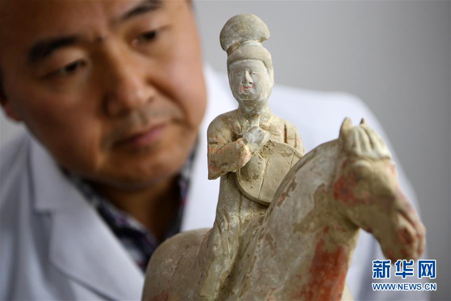 2019年12月27日,在天水市博物館文物保護修復(fù)中心陶、玉石器文物修復(fù)室,專業(yè)技術(shù)人員孟旭輝在觀察一件唐代彩繪陶俑的病害情況。 甘肅省天水市博物館文物保護修復(fù)中心有一支專業(yè)的文物修復(fù)隊伍,共有14名專業(yè)技術(shù)人員。從2012年正式成立以來,他們不僅承擔著對館藏和館外文物的修復(fù)工作,還參與了多次文化遺存的調(diào)查和搶救性發(fā)掘、古建筑彩畫保護、古墓葬搬遷復(fù)原等工作。一件件殘缺破損、滿身病害的文物經(jīng)過他們的巧手修復(fù),又重新煥發(fā)光彩,展示在公眾面前。 新華社記者 馬寧 攝