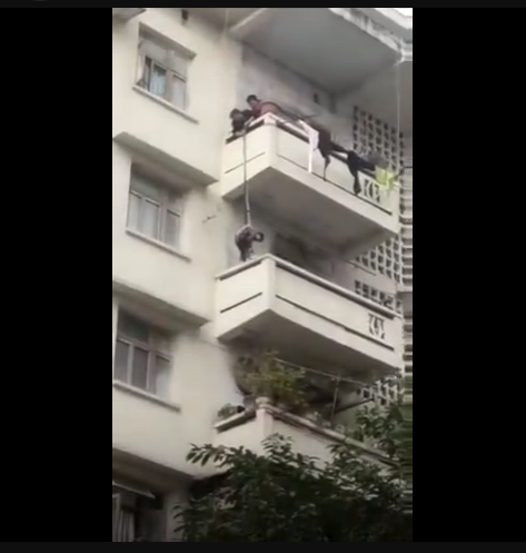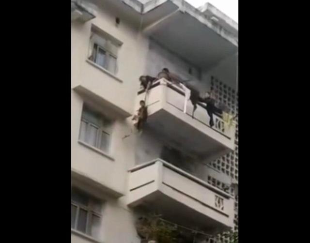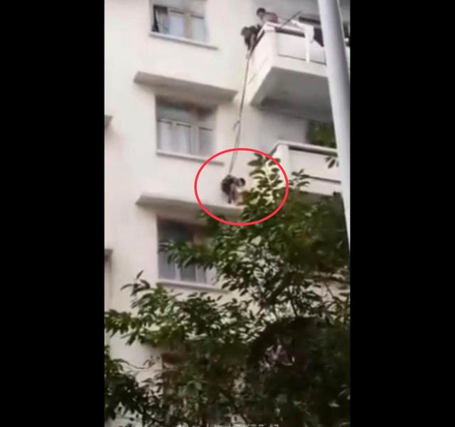 一只貓跑到了百順街老百貨公司宿舍樓三樓的窗戶遮雨臺上,被5樓的老太太發(fā)現(xiàn),老太太善心發(fā)作,竟將孫子用繩子吊起,從5樓慢慢放至3樓救貓,整個過程不禁令人捏汗。
