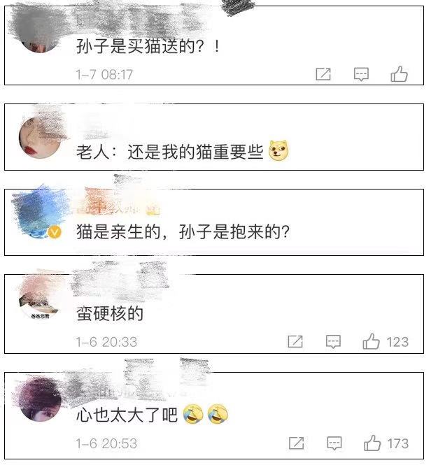 看到這一幕的網(wǎng)友忍不住調(diào)侃:難道孫子是奶奶買貓送的?