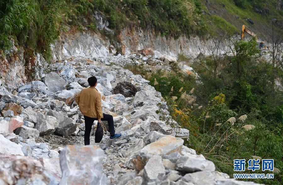 八好村駐村第一書記韋德王徒步前往弄麻屯開展扶貧工作,弄麻屯的公路尚在建設(shè)當(dāng)中(2019年12月16日攝)。新華社記者黃孝邦攝