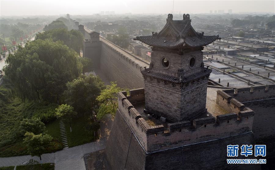 這是7月20日無人機拍攝的平遙城墻上的角樓。