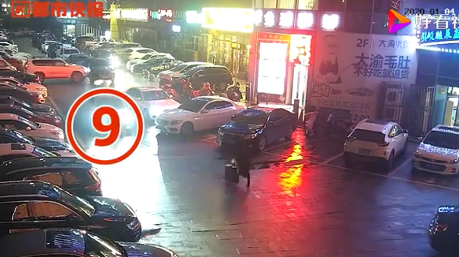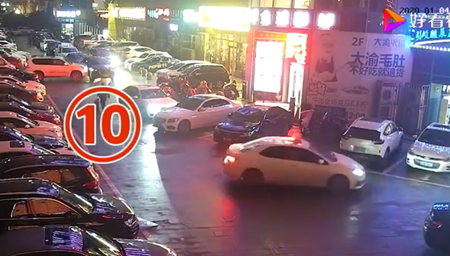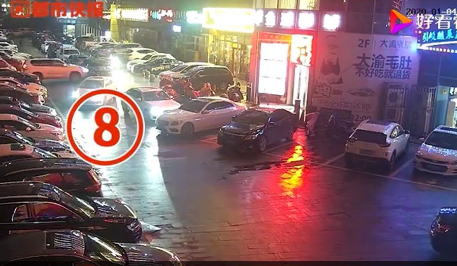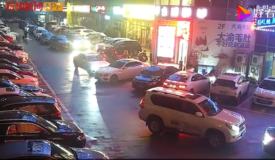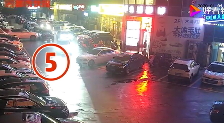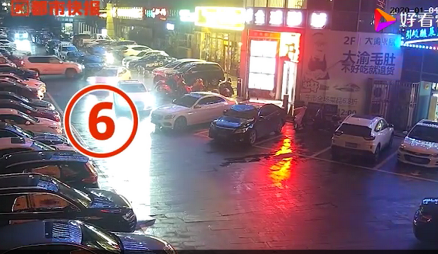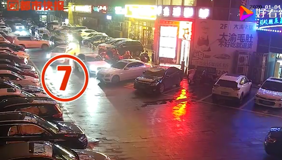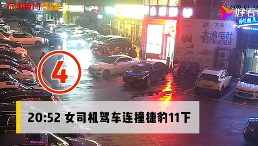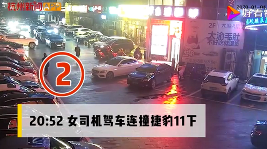 通過監(jiān)控發(fā)現(xiàn),捷豹車當(dāng)時并沒有停在停車位上,而是橫著停在停車位前的通道上,正好擋住了停在停車位里面的車輛。晚上8點40左右,一輛白色豐田普拉多越野車被捷豹擋住無法出去,10多分鐘后,司機通過倒車再加速十幾次撞擊捷豹,最終把車輛撞開后駛離現(xiàn)場。