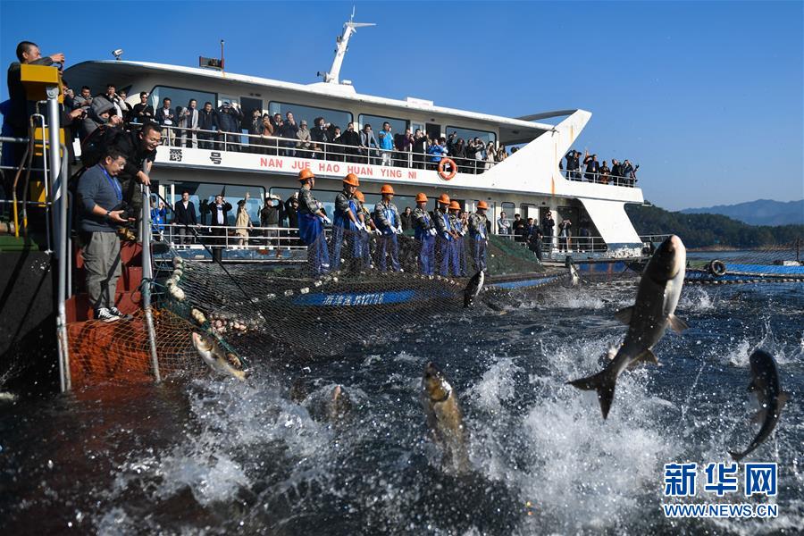 11月28日,游客在千島湖觀看巨網(wǎng)捕魚。新華社記者黃宗治攝