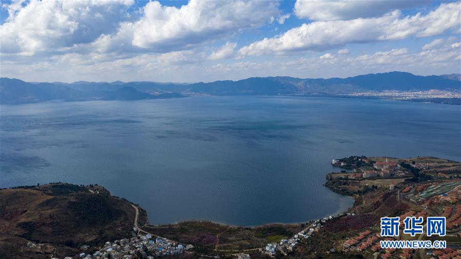空中俯瞰撫仙湖(無人機照片,1月10日攝)。 來自云南省玉溪市撫仙湖管理局的數(shù)據顯示,撫仙湖2019年度保持一類水質,總磷、總氮等數(shù)值較2018年有所下降。 新華社記者 江文耀 攝