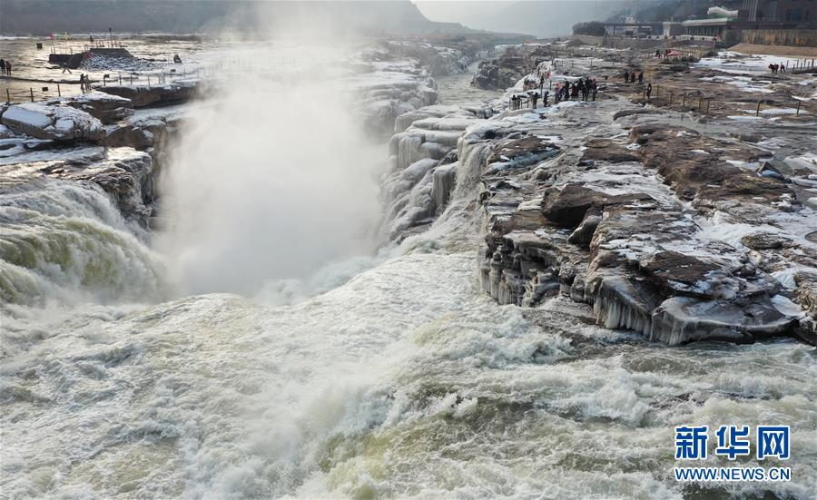 1月12日拍攝的黃河壺口瀑布的“水底冒煙”景觀(無人機(jī)照片)。新華社記者陶明攝