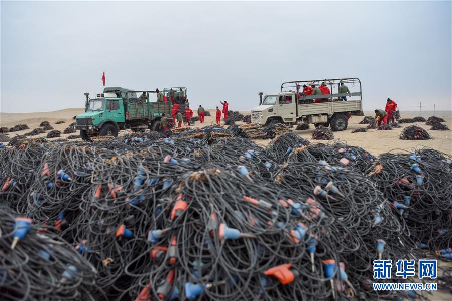 1月14日,放線工在出工前將一捆捆檢波器裝車。地球物理勘探是油氣開發(fā)的第一步,相當于給地球做CT。物探工人按照嚴格的測線部署,在相應位置鉆井,然后實施地震,采集地震波數(shù)據(jù)。科研人員通過數(shù)據(jù)組成的“CT片”,就能夠清晰地“看”到地下的地質結構,判斷哪里埋藏有石油或者天然氣。2019年10月,東方地球物理勘探有限責任公司塔里木物探處2113隊進入新疆塔克拉瑪干沙漠腹地,開始中古14-21、塔中2兩個區(qū)塊的三維地震勘探。近2000名物探工人將在1000平方公里的范圍內一直工作到2020年4月,這也意味著他們將在塔克拉瑪干沙漠腹地連續(xù)度過第14個除夕夜。蘊藏著豐富石油天然氣資源的新疆塔克拉瑪干沙漠有“死亡之海”之稱,氣候干燥,年降水量在50毫米以下,冬季地表最低溫度超過零下30攝氏度,是世界油氣勘探難度最大的地區(qū)之一。為避開風季,物探工人每年9、10月份進入沙漠,一直工作到來年4月,夜以繼日與黃沙、嚴寒為伴,用辛勤的汗水,為祖國找油找氣。新華社記者丁磊攝