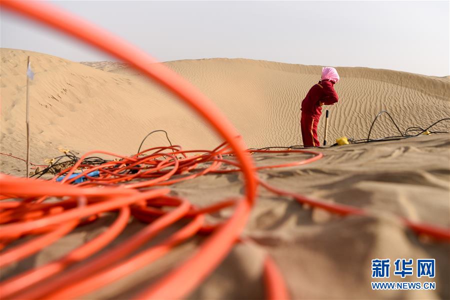 1月14日,放線工張進秀在放完一組檢波器后直起腰休息。地球物理勘探是油氣開發(fā)的第一步,相當于給地球做CT。物探工人按照嚴格的測線部署,在相應位置鉆井,然后實施地震,采集地震波數(shù)據(jù)。科研人員通過數(shù)據(jù)組成的“CT片”,就能夠清晰地“看”到地下的地質(zhì)結(jié)構(gòu),判斷哪里埋藏有石油或者天然氣。2019年10月,東方地球物理勘探有限責任公司塔里木物探處2113隊進入新疆塔克拉瑪干沙漠腹地,開始中古14-21、塔中2兩個區(qū)塊的三維地震勘探。近2000名物探工人將在1000平方公里的范圍內(nèi)一直工作到2020年4月,這也意味著他們將在塔克拉瑪干沙漠腹地連續(xù)度過第14個除夕夜。蘊藏著豐富石油天然氣資源的新疆塔克拉瑪干沙漠有“死亡之?!敝Q,氣候干燥,年降水量在50毫米以下,冬季地表最低溫度超過零下30攝氏度,是世界油氣勘探難度最大的地區(qū)之一。為避開風季,物探工人每年9、10月份進入沙漠,一直工作到來年4月,夜以繼日與黃沙、嚴寒為伴,用辛勤的汗水,為祖國找油找氣。新華社記者丁磊攝