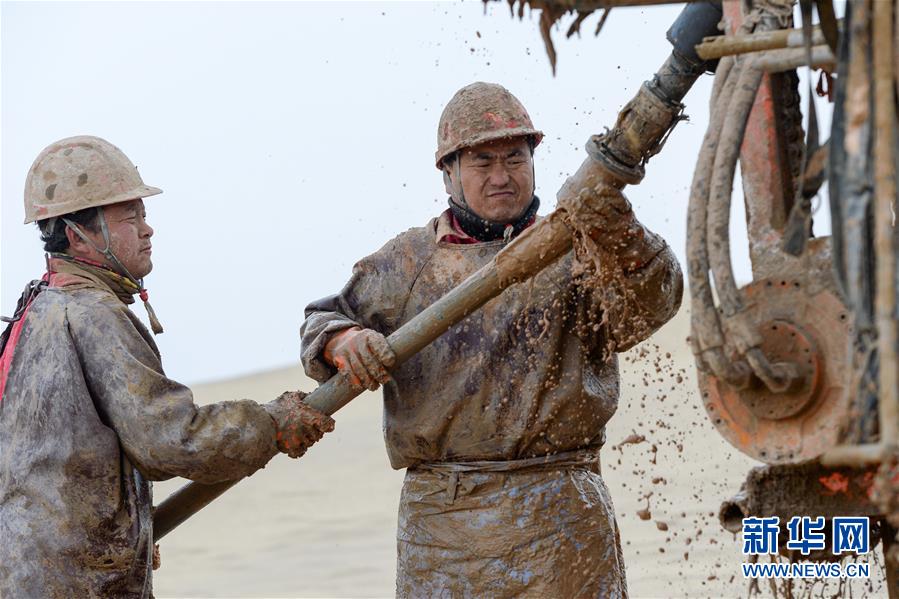 1月13日,鉆井工在連接鉆桿。地球物理勘探是油氣開發(fā)的第一步,相當于給地球做CT。物探工人按照嚴格的測線部署,在相應(yīng)位置鉆井,然后實施地震,采集地震波數(shù)據(jù)。科研人員通過數(shù)據(jù)組成的“CT片”,就能夠清晰地“看”到地下的地質(zhì)結(jié)構(gòu),判斷哪里埋藏有石油或者天然氣。2019年10月,東方地球物理勘探有限責任公司塔里木物探處2113隊進入新疆塔克拉瑪干沙漠腹地,開始中古14-21、塔中2兩個區(qū)塊的三維地震勘探。近2000名物探工人將在1000平方公里的范圍內(nèi)一直工作到2020年4月,這也意味著他們將在塔克拉瑪干沙漠腹地連續(xù)度過第14個除夕夜。蘊藏著豐富石油天然氣資源的新疆塔克拉瑪干沙漠有“死亡之?!敝Q,氣候干燥,年降水量在50毫米以下,冬季地表最低溫度超過零下30攝氏度,是世界油氣勘探難度最大的地區(qū)之一。為避開風季,物探工人每年9、10月份進入沙漠,一直工作到來年4月,夜以繼日與黃沙、嚴寒為伴,用辛勤的汗水,為祖國找油找氣。新華社記者丁磊攝
