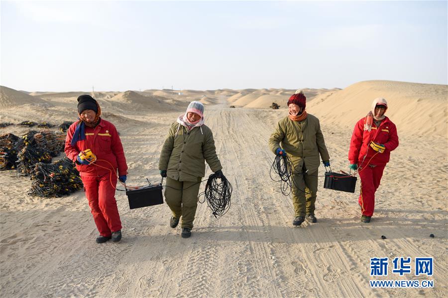 1月14日,4名測(cè)線女工抬著電瓶返回營(yíng)地。地球物理勘探是油氣開發(fā)的第一步,相當(dāng)于給地球做CT。物探工人按照嚴(yán)格的測(cè)線部署,在相應(yīng)位置鉆井,然后實(shí)施地震,采集地震波數(shù)據(jù)??蒲腥藛T通過數(shù)據(jù)組成的“CT片”,就能夠清晰地“看”到地下的地質(zhì)結(jié)構(gòu),判斷哪里埋藏有石油或者天然氣。2019年10月,東方地球物理勘探有限責(zé)任公司塔里木物探處2113隊(duì)進(jìn)入新疆塔克拉瑪干沙漠腹地,開始中古14-21、塔中2兩個(gè)區(qū)塊的三維地震勘探。近2000名物探工人將在1000平方公里的范圍內(nèi)一直工作到2020年4月,這也意味著他們將在塔克拉瑪干沙漠腹地連續(xù)度過第14個(gè)除夕夜。蘊(yùn)藏著豐富石油天然氣資源的新疆塔克拉瑪干沙漠有“死亡之?!敝Q,氣候干燥,年降水量在50毫米以下,冬季地表最低溫度超過零下30攝氏度,是世界油氣勘探難度最大的地區(qū)之一。為避開風(fēng)季,物探工人每年9、10月份進(jìn)入沙漠,一直工作到來年4月,夜以繼日與黃沙、嚴(yán)寒為伴,用辛勤的汗水,為祖國(guó)找油找氣。新華社記者丁磊攝
