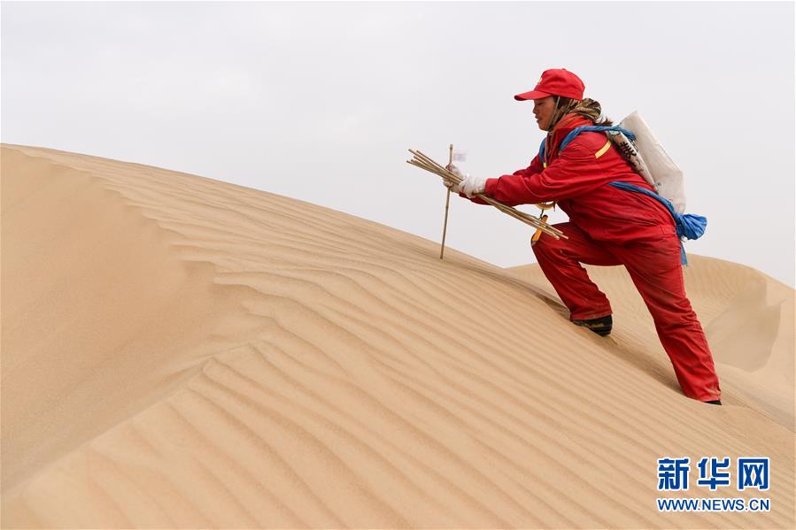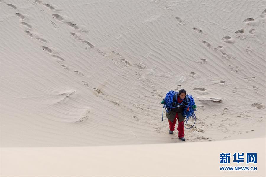 查線工周福香扛著采集電纜翻越沙山(1月15日攝)。 新華社記者 丁磊 攝