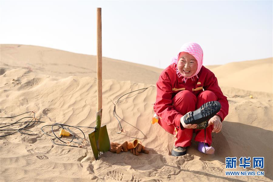 放線工陳莉云在休息時(shí)清理鞋中的沙子(1月14日攝)。 新華社記者 丁磊 攝