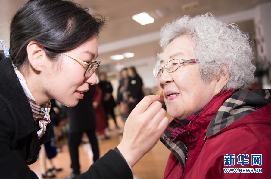 1月17日,張丹俠(左)為前去報(bào)名參加杭州市社會(huì)福利中心模特隊(duì)的王育華涂口紅。新華社記者 翁忻旸 攝