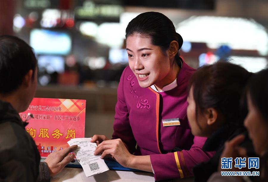 吉如在西安北站咨詢服務(wù)臺解答旅客的問題(1月15日攝)。新華社記者陶明攝