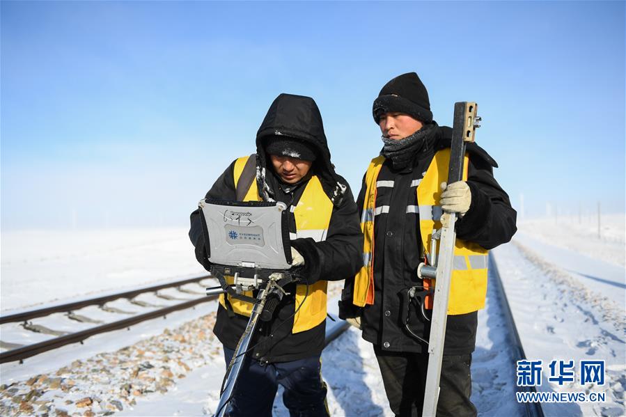 1月13日,白音庫倫綜合維修車間職工操作儀器檢查鐵軌。新華社記者劉磊攝