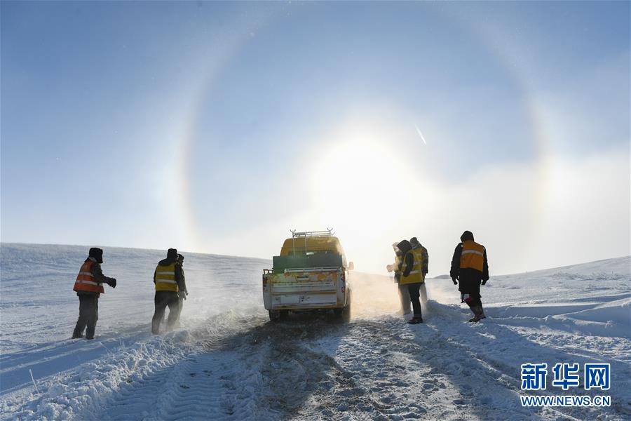 1月13日,車輛在途中打滑,白音庫(kù)倫綜合維修車間的職工們查看路況。新華社記者劉磊攝