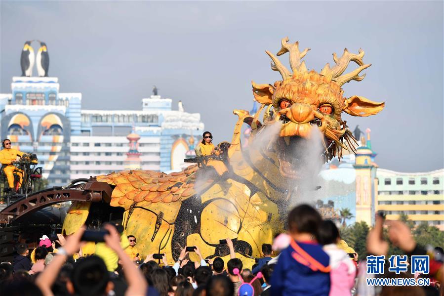 1月18日,大型機械裝置藝術(shù)品“龍馬精神”在珠海長隆海洋王國巡游展示。新華社記者 劉大偉 攝