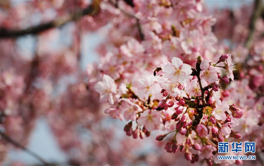 2月24日,蜜蜂在上海松江辰山植物園內(nèi)盛開的河津櫻櫻花叢中飛舞。近日,上海松江區(qū)辰山植物園內(nèi)的河津櫻絢麗綻放,花團(tuán)錦簇間一派盎然春意。 新華社記者 方喆 攝