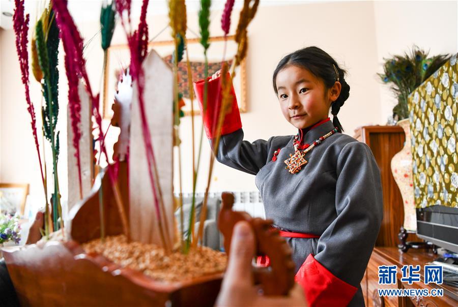 一名身著藏裝的藏族小姑娘在吃切瑪(2月24日攝)。當日是藏歷新年初一,西藏各地群眾歡度藏歷新年。受新冠肺炎疫情影響,當?shù)靥岢娫挵菽?、少出門、不聚集,居家享受新年樂趣。新華社記者晉美多吉攝