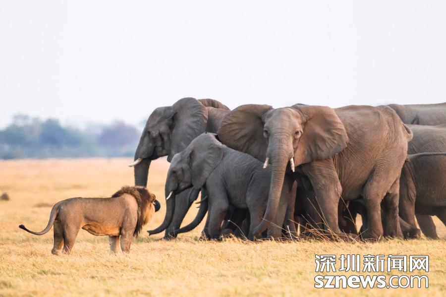 英國(guó)攝影師詹姆斯(James Gifford)在博茨瓦納喬貝國(guó)家公園拍到一群獅子獵食大象的精彩畫面。在詹姆斯的鏡頭下,一頭母獅跳到了一頭小象的背上想要將其拿下,但僅憑一己之力又不能做到。但當(dāng)母獅的后援抵達(dá)時(shí),象群也趕到了現(xiàn)場(chǎng)。最終,小象回到了象群中獲得庇護(hù),而獅群也不得不悻悻離去。