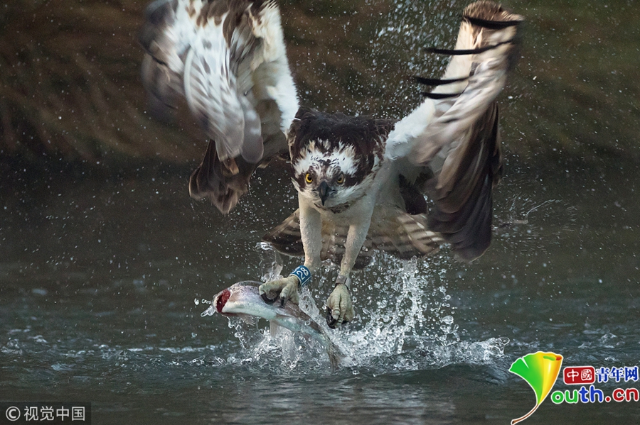 一只魚鷹潛入湖中捉鱒魚,激起巨大的水花。圖片作者/視覺中國