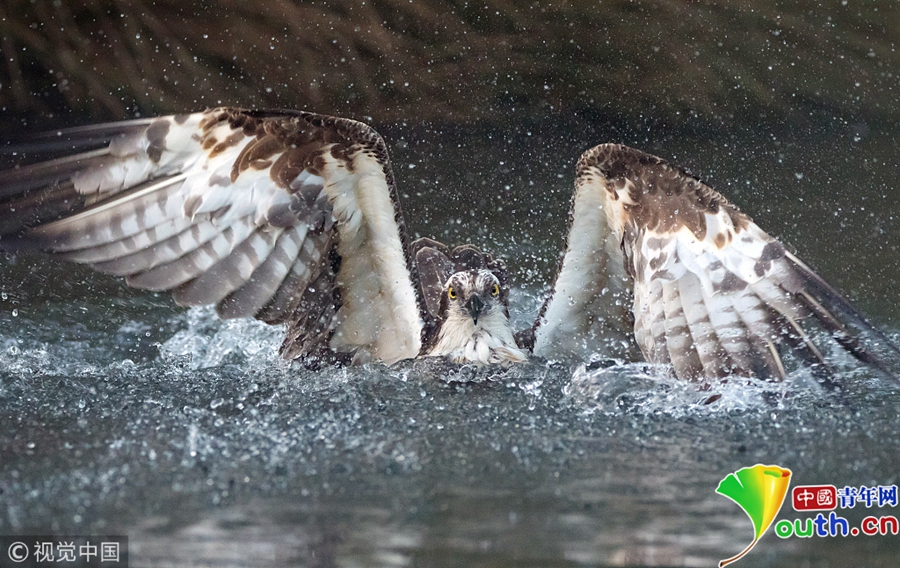一只魚(yú)鷹潛入湖中捉鱒魚(yú),激起巨大的水花。