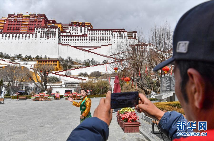 3月1日,布達(dá)拉宮管理處講解員次仁卓嘎(左)在進(jìn)行直播。新華社記者春拉攝