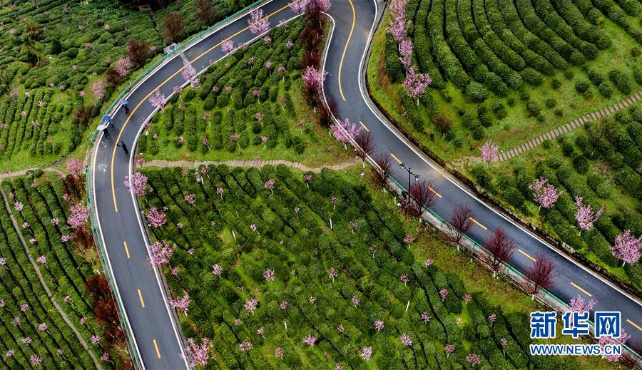 3月2日,游人在春雨中游覽平利縣長(zhǎng)安鎮(zhèn)洪福茶山(無人機(jī)照片)。新華社記者陶明攝
