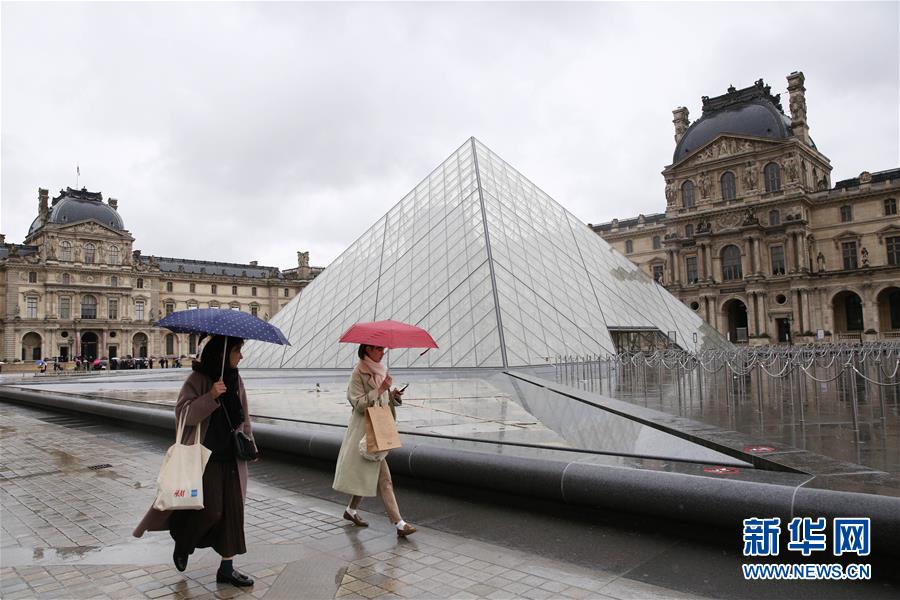 3月2日,在法國巴黎,游客撐傘走過盧浮宮的玻璃金字塔。新華社記者 高靜 攝