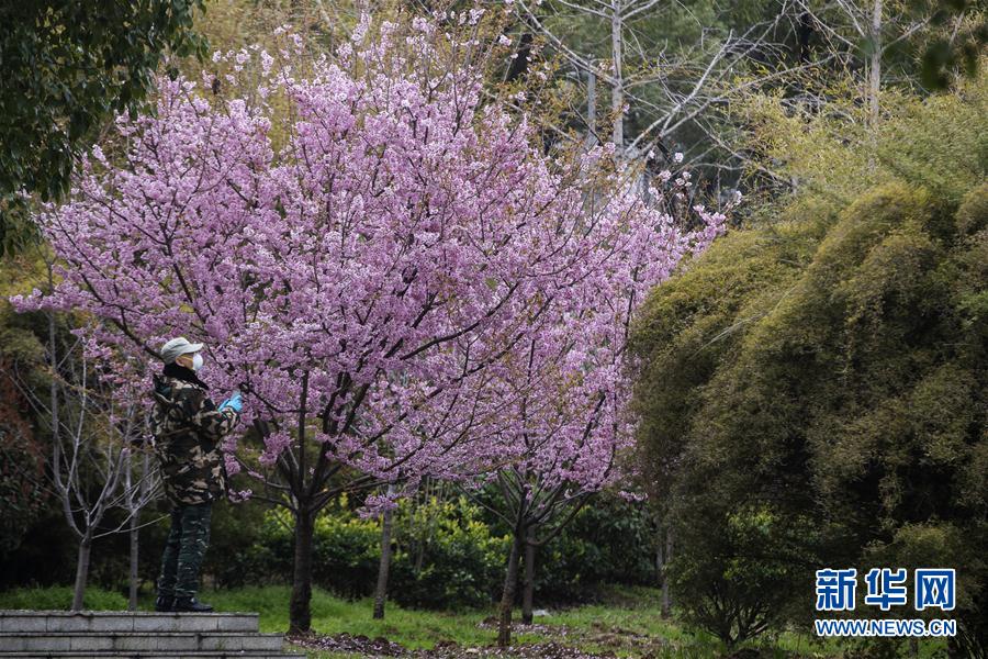 3月3日,一名工作人員在觀賞盛開(kāi)的櫻花。 新華社記者 費(fèi)茂華 攝