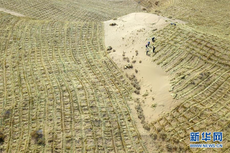 3月5日,在古浪縣北部沙區(qū)旱麻崗治沙點(diǎn),群眾扎草方格壓沙(無人機(jī)照片)。初春時(shí)節(jié),在騰格里沙漠南緣的甘肅省武威市古浪縣,當(dāng)?shù)馗刹柯毠ぜ鞍瞬缴沉謭?chǎng)治沙人共同在縣城北部沙區(qū)旱麻崗治沙點(diǎn)開展春季治沙勞動(dòng)。新華社記者 范培珅 攝