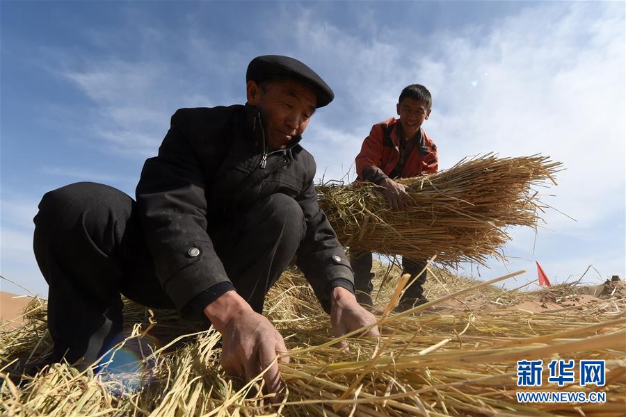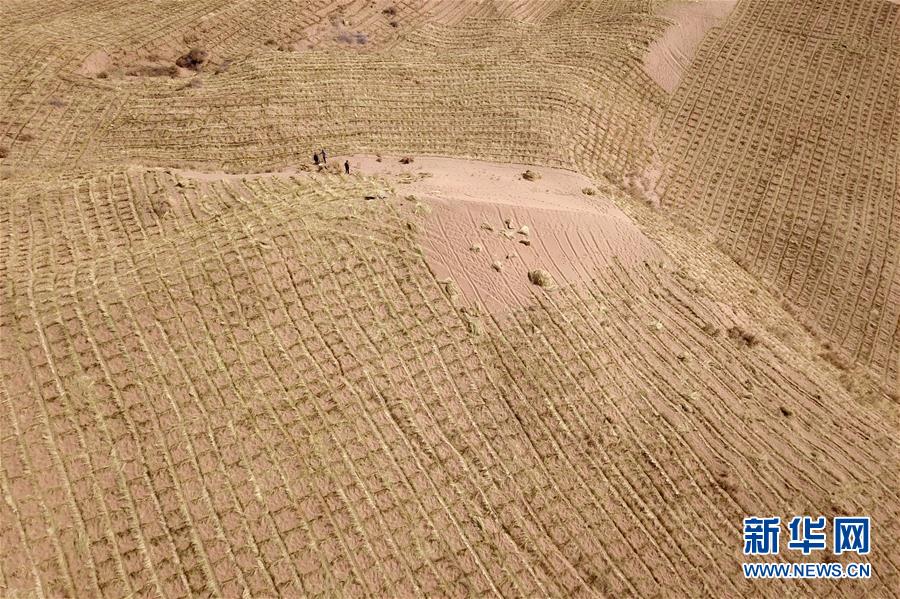 3月5日,在古浪縣北部沙區(qū)旱麻崗治沙點(diǎn),八步沙林場(chǎng)第二代治沙人郭萬剛(左)和第三代治沙人郭璽扎草方格壓沙。初春時(shí)節(jié),在騰格里沙漠南緣的甘肅省武威市古浪縣,當(dāng)?shù)馗刹柯毠ぜ鞍瞬缴沉謭?chǎng)治沙人共同在縣城北部沙區(qū)旱麻崗治沙點(diǎn)開展春季治沙勞動(dòng)。新華社記者 范培珅 攝