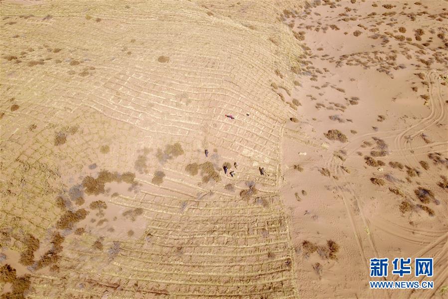 3月5日,在古浪縣北部沙區(qū)旱麻崗治沙點,群眾扎草方格壓沙(無人機照片)。初春時節(jié),在騰格里沙漠南緣的甘肅省武威市古浪縣,當?shù)馗刹柯毠ぜ鞍瞬缴沉謭鲋紊橙斯餐诳h城北部沙區(qū)旱麻崗治沙點開展春季治沙勞動。新華社記者 范培珅 攝