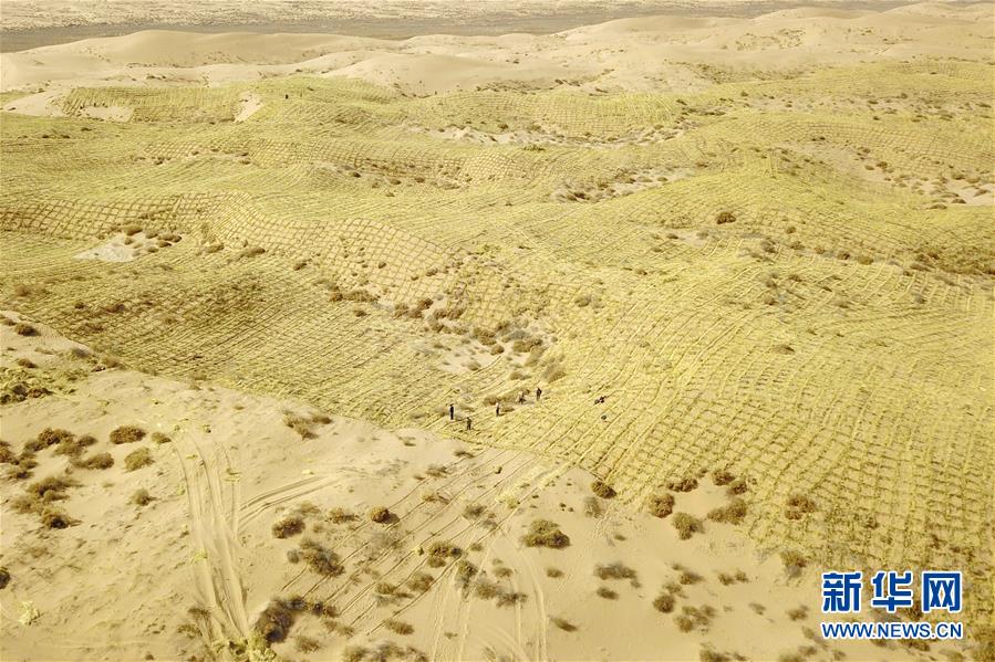 3月5日,在古浪縣北部沙區(qū)旱麻崗治沙點(diǎn),群眾扎草方格壓沙(無人機(jī)照片)。初春時節(jié),在騰格里沙漠南緣的甘肅省武威市古浪縣,當(dāng)?shù)馗刹柯毠ぜ鞍瞬缴沉謭鲋紊橙斯餐诳h城北部沙區(qū)旱麻崗治沙點(diǎn)開展春季治沙勞動。新華社記者 范培珅 攝