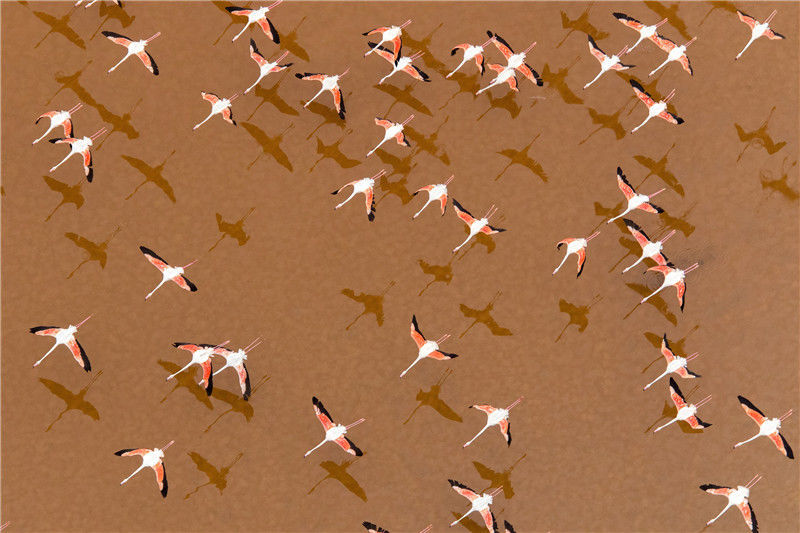 2018年1月9日訊(具體拍攝時(shí)間不詳), 西班牙卡迪茲海灣,數(shù)百只粉紅色的火烈鳥飛過五顏六色的鹽沼,在水面上形成令人驚嘆的倒影。太陽落山時(shí)分,攝影師Oscar Diez在300米高空的飛機(jī)上拍下這些令人震撼的照片。Oscar Diez/Solent News/視覺中國(guó)