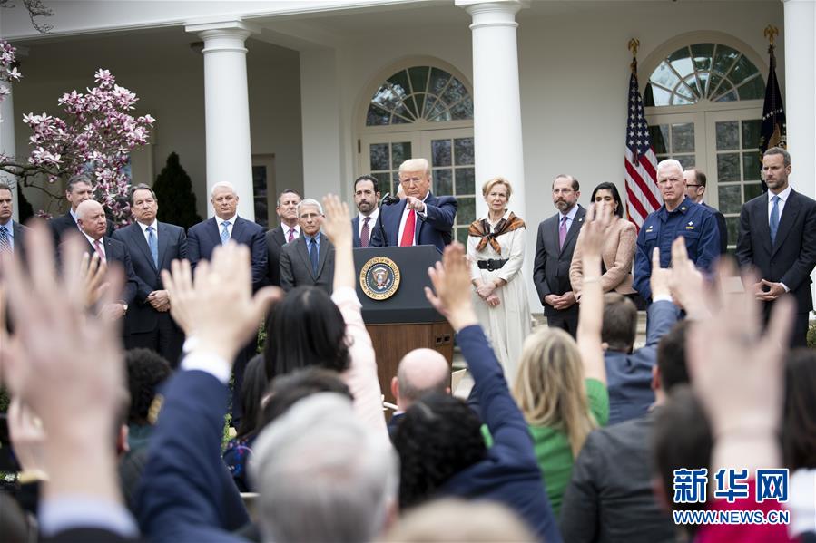 3月13日,在美國華盛頓白宮,美國總統(tǒng)特朗普(中)出席記者會。特朗普當天下午在白宮發(fā)表講話時正式宣布“國家緊急狀態(tài)”。他說,此舉旨在讓美國聯邦政府全力投入到抗擊新冠肺炎疫情的努力中。這項舉措將釋放500億美元資金,幫助各州和地方政府應對疫情。新華社記者劉杰攝
